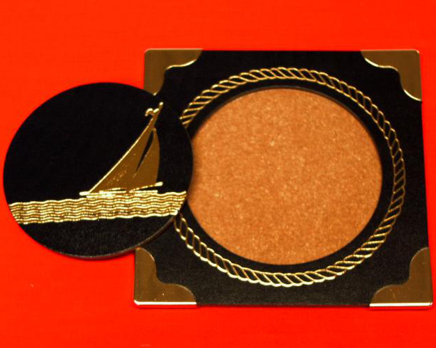 Die marineblauen Sets sind durch eine hochglänzende Goldprägung veredelt. Die echt vergoldeten Metallecken der Glasuntersetzer mit herausnehmbarem Innenteil verleihen diesem Set außergewöhnliche